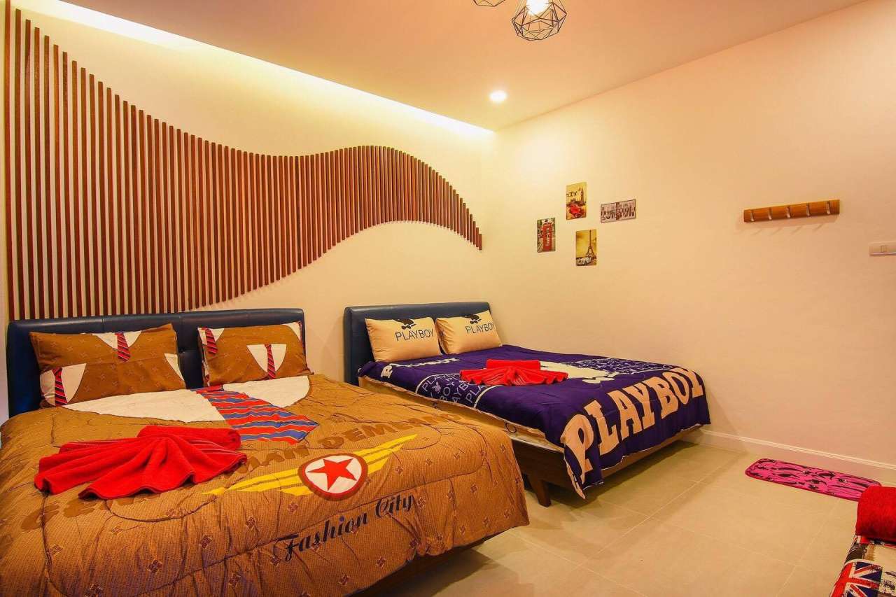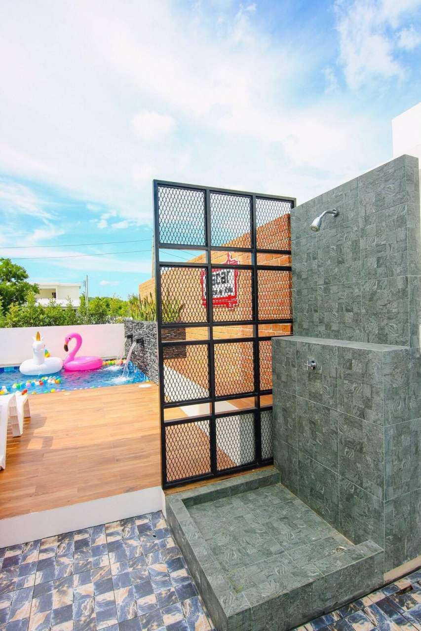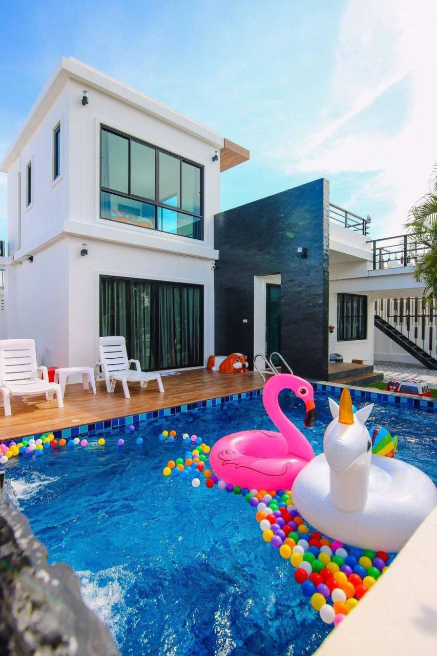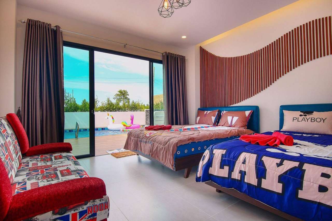 3 ห้องนอน (แอร์) 3 ห้องน้ำ 1 ห้องนั่งเล่น (แอร์) 1 ห้องครัวอุปกรณ์ครบครัน รองรับผู้เข้าพัก 8 คน สำหรับเด็กต่ำกว่า 10 ขวบ ฟรี 2 คน คนที่ 9 ขึ้นไป เพิ่มคนละ 300 บาท พักสูงสุด 15 ท่าน (พร้อมที่นอนเสริม) มีสระว่ายน้ำส่วนตัว ขนาด 3*7 เมตร สามารถเสียงดังได้ถึง 22.00 น. มีสิ่งอำนวยความสะดวกครบครัน คาราโอเกะ ไฟเธค โต๊ะพูล ทีวี ตู้เย็น อุปกรณ์เครื่องครัวครบชุด อุปกรณ์เครื่องใช้ส่วนตัวต้องเตรียมมาเอง เช่น ผ้าขนหนู แชมพู ยาสระผม