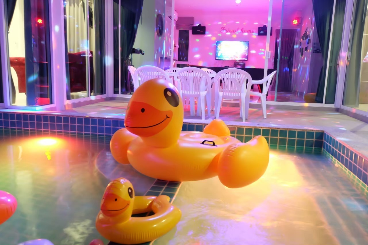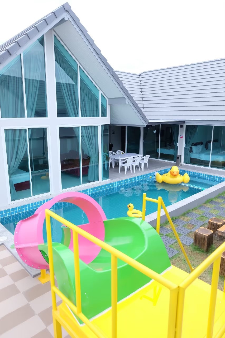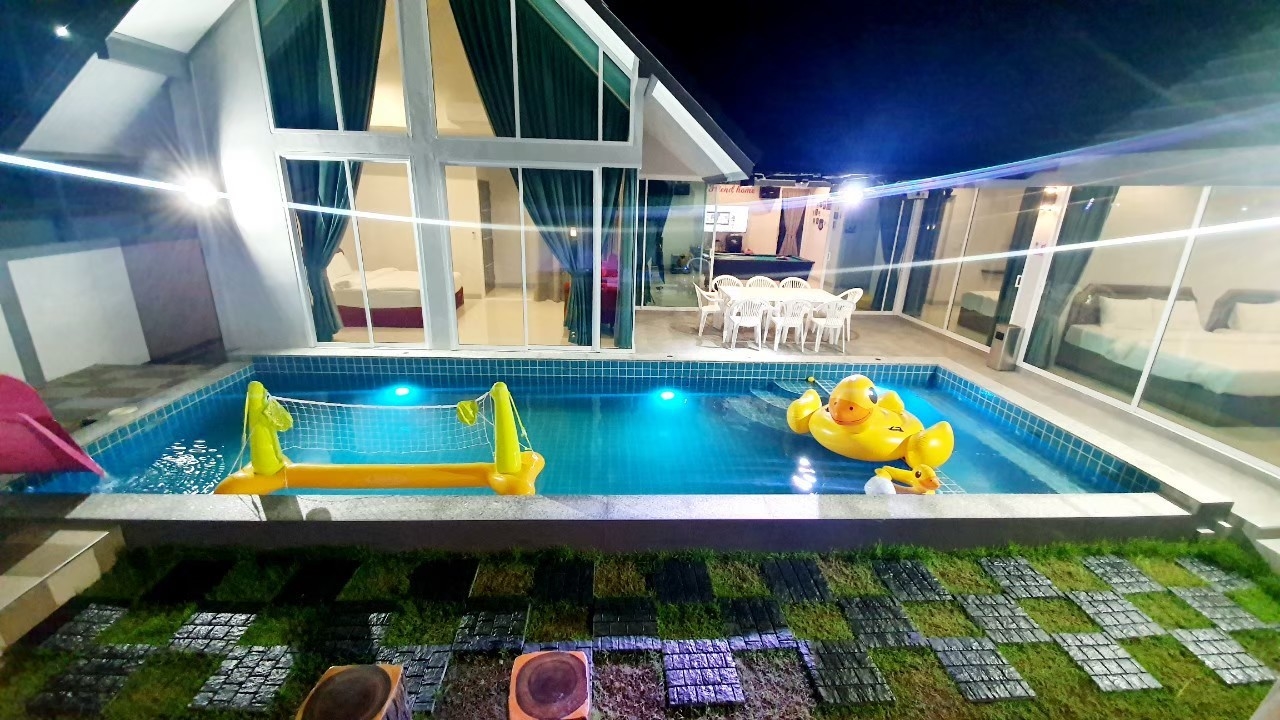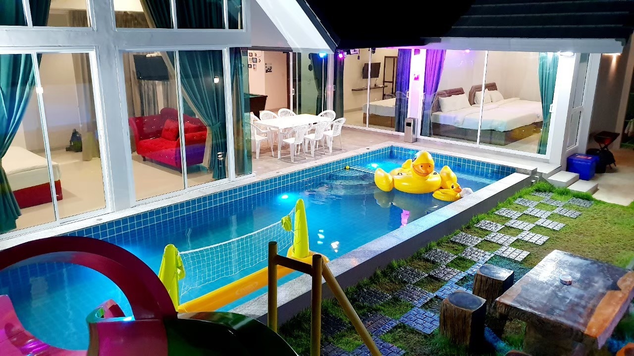 4 ห้องนอน (แอร์) 3 ห้องน้ำ 1 ห้องนั่งเล่น (แอร์) 1 ห้องครัวอุปกรณ์ครบครัน รองรับผู้เข้าพัก 15 คน คนที่ 16 ขึ้นไป เพิ่มคนละ 300 บาท พักสูงสุด 18 ท่าน มีสระว่ายน้ำส่วนตัว ขนาด 4*6 เมตร สามารถเสียงดังได้ถึง 22.00 น. สิ่งอำนวยความสะดวกครบครัน ทีวี ฟรีคาราโอเกะ โต๊ะพูล สไลเดอร์ wifi ตู้เย็น อุปกรณ์เครื่องครัวครบชุด อุปกรณ์เครื่องใช้ส่วนตัวต้องเตรียมมาเอง เช่น ผ้าขนหนู แชมพู ยาสระผม (ห้ามนำสัตว์เลี้ยงเข้าพักทุกชนิด)