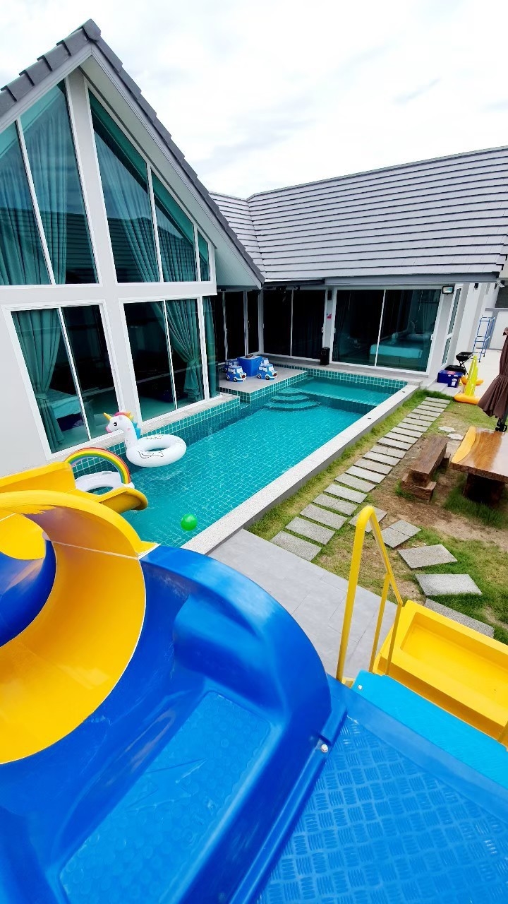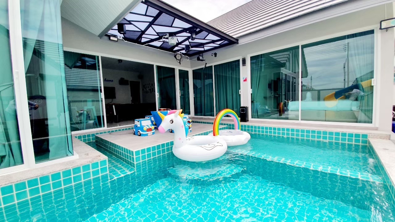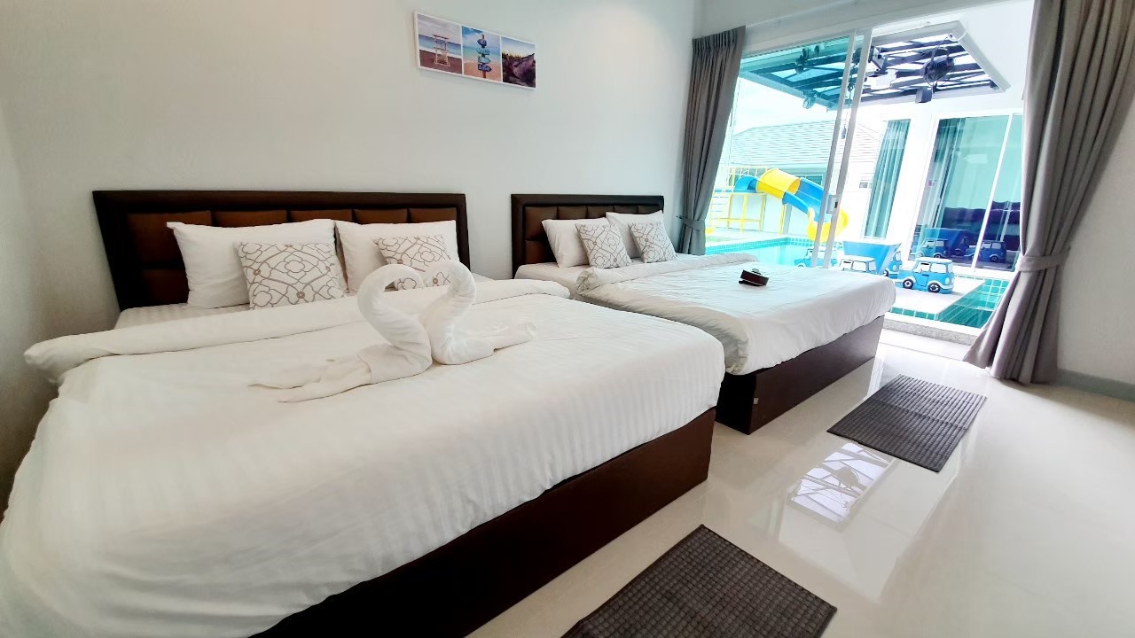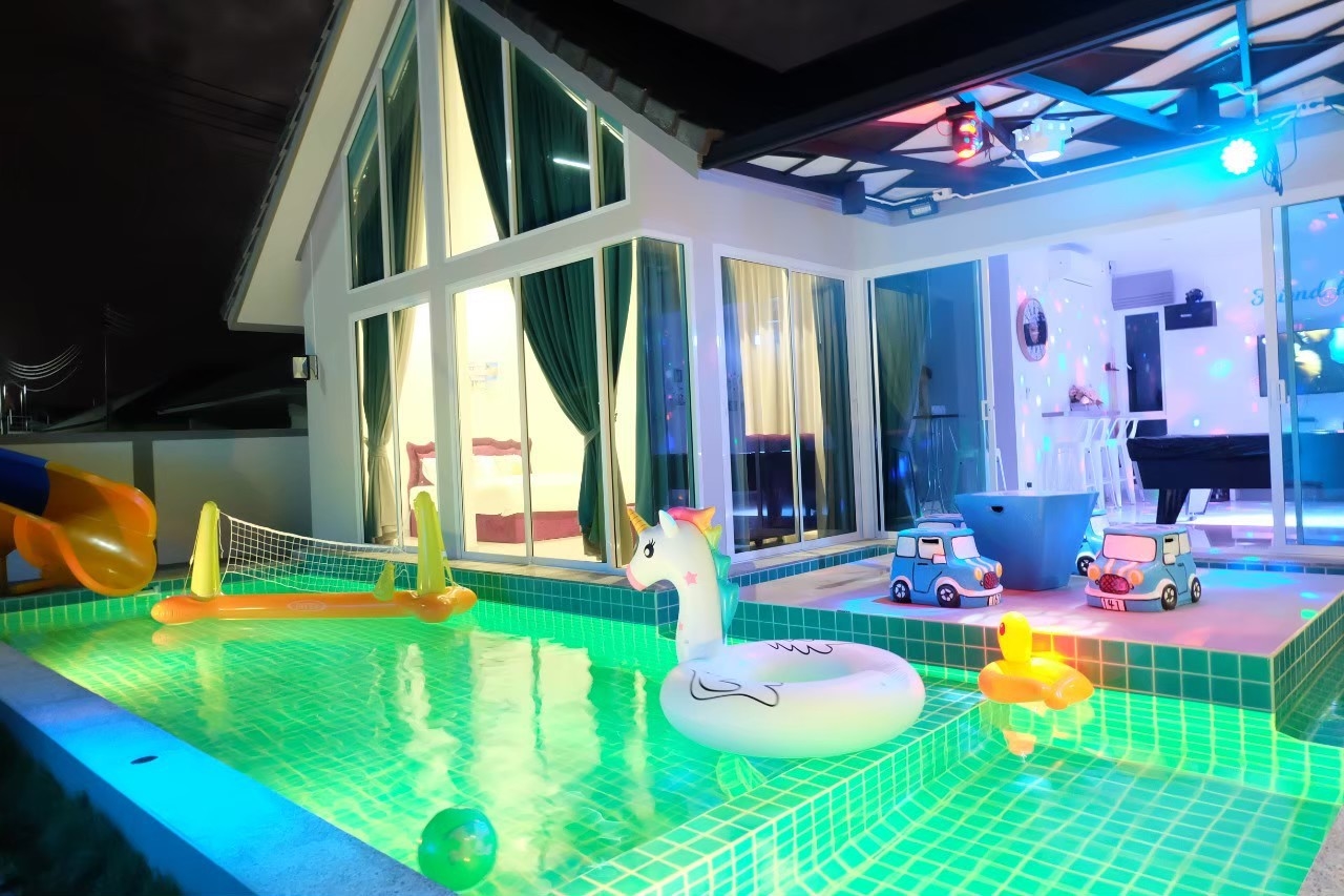 4 ห้องนอน (แอร์) 3 ห้องน้ำ 1 ห้องนั่งเล่น (แอร์) 1 ห้องครัวอุปกรณ์ครบครัน รองรับผู้เข้าพัก 15 คน คนที่ 16 ขึ้นไป เพิ่มคนละ 300 บาท พักสูงสุด 18 ท่าน มีสระว่ายน้ำส่วนตัว ขนาด 4*6 เมตร สามารถเสียงดังได้ถึง 22.00 น. สิ่งอำนวยความสะดวกครบครัน ทีวี ฟรีคาราโอเกะ โต๊ะพูล สไลเดอร์ wifi ตู้เย็น อุปกรณ์เครื่องครัวครบชุด อุปกรณ์เครื่องใช้ส่วนตัวต้องเตรียมมาเอง เช่น ผ้าขนหนู แชมพู ยาสระผม (ห้ามนำสัตว์เลี้ยงเข้าพักทุกชนิด)