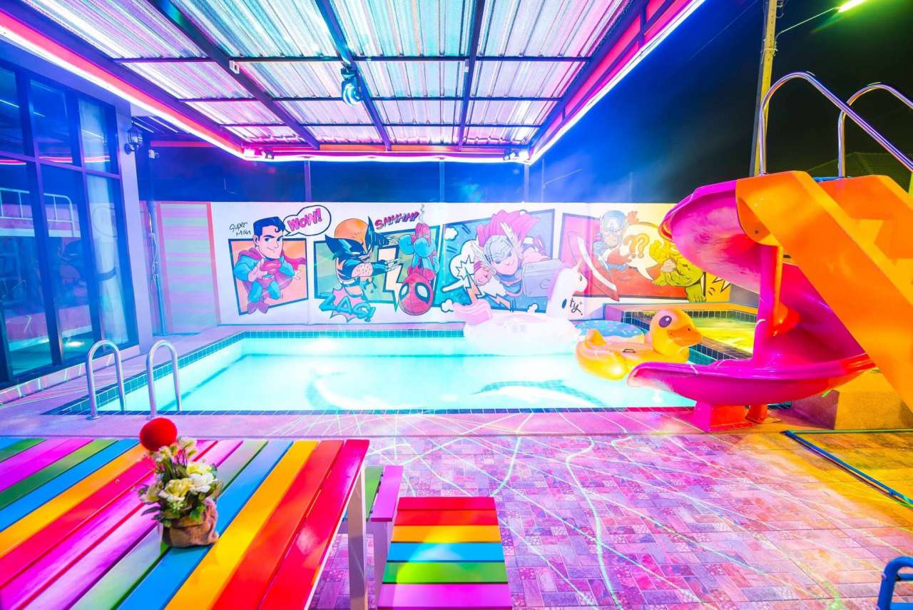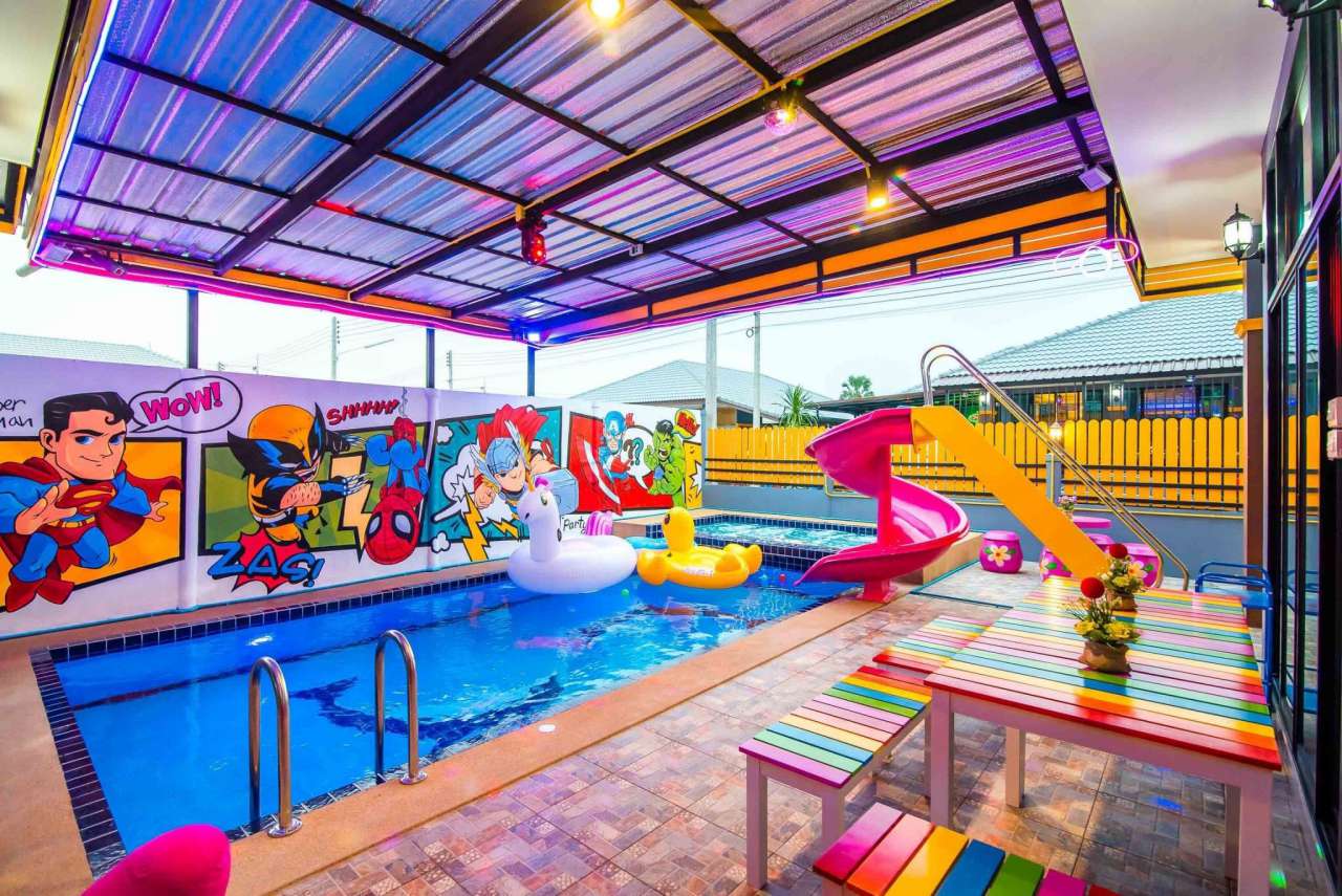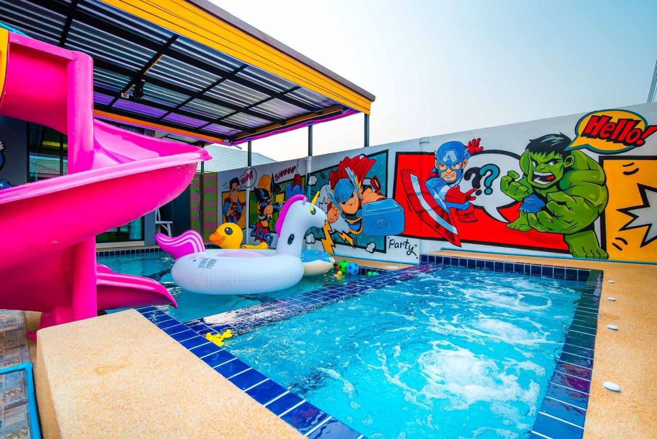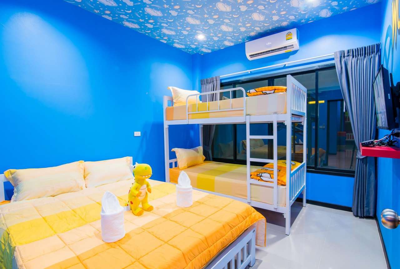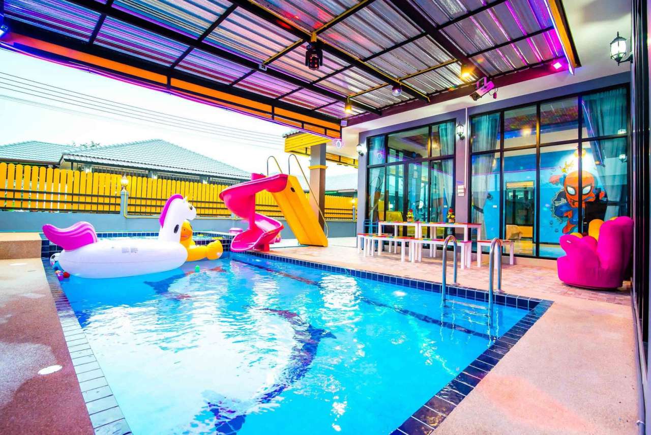 5 ห้องนอน (แอร์) 3 ห้องน้ำ 1 ห้องนั่งเล่น (แอร์) 1 ห้องครัวอุปกรณ์ครบครัน รองรับผู้เข้าพัก 20 คน คนที่ 21 ขึ้นไป เพิ่มคนละ 300 บาท พักสูงสุด 30 ท่าน (พร้อมที่นอนเสริมครบทุกท่าน) มีสระว่ายน้ำส่วนตัว ขนาด 4*7 เมตร สามารถเสียงดังได้ถึง 22.00 น. มีสิ่งอำนวยความสะดวกครบครัน ทีวี ตู้เย็น คาราโอเกะ สไลเดอร์ ไฟเธค โต๊ะสนุก Wi-Fi อุปกรณ์เครื่องครัวครบชุด อุปกรณ์เครื่องใช้ส่วนตัวต้องเตรียมมาเอง เช่น ผ้าขนหนู แชมพู ยาสระผม