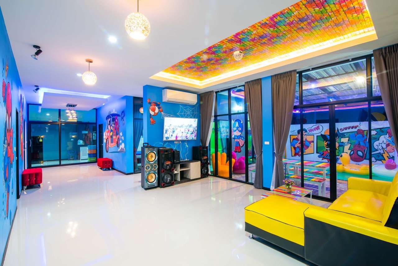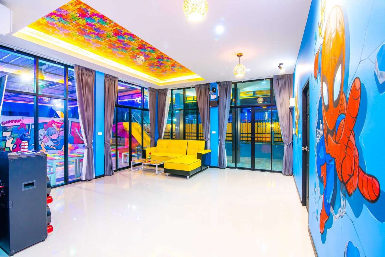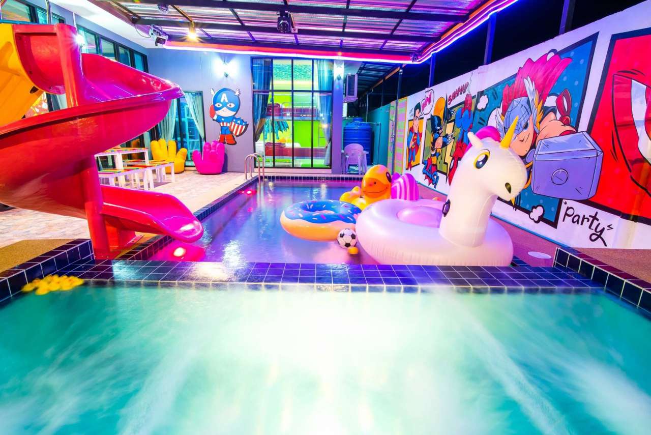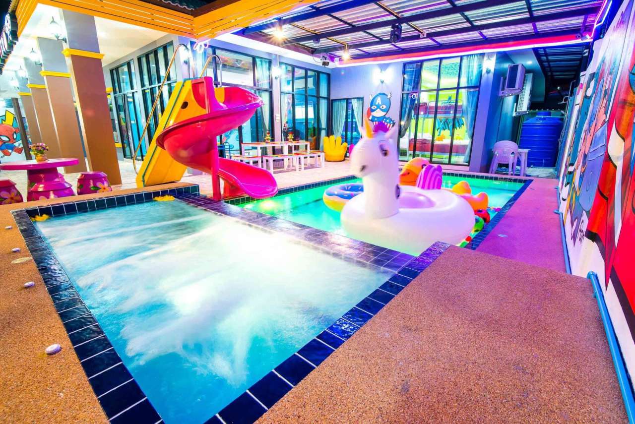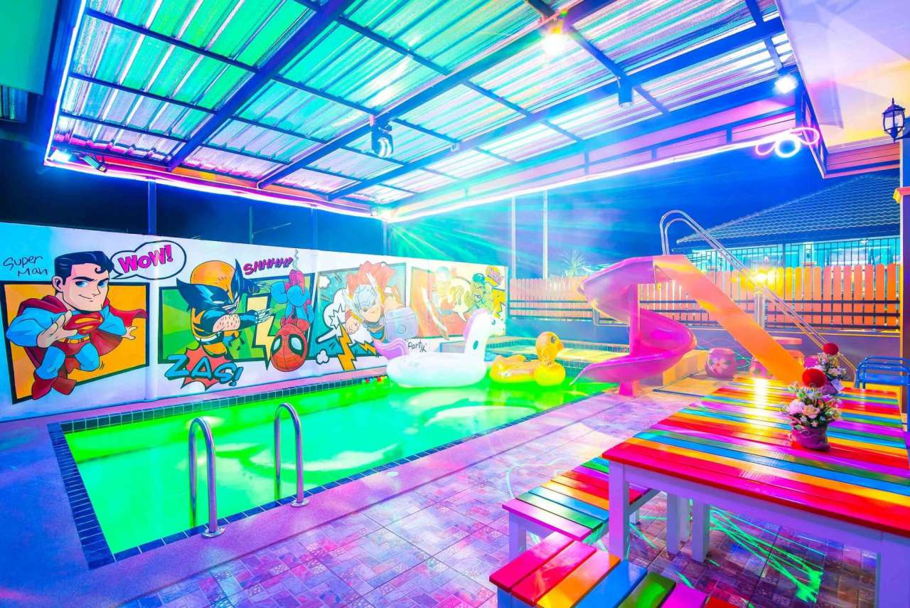 5 ห้องนอน (แอร์) 3 ห้องน้ำ 1 ห้องนั่งเล่น (แอร์) 1 ห้องครัวอุปกรณ์ครบครัน รองรับผู้เข้าพัก 20 คน คนที่ 21 ขึ้นไป เพิ่มคนละ 300 บาท พักสูงสุด 30 ท่าน (พร้อมที่นอนเสริมครบทุกท่าน) มีสระว่ายน้ำส่วนตัว ขนาด 4*7 เมตร สามารถเสียงดังได้ถึง 22.00 น. มีสิ่งอำนวยความสะดวกครบครัน ทีวี ตู้เย็น คาราโอเกะ สไลเดอร์ ไฟเธค โต๊ะสนุก Wi-Fi อุปกรณ์เครื่องครัวครบชุด อุปกรณ์เครื่องใช้ส่วนตัวต้องเตรียมมาเอง เช่น ผ้าขนหนู แชมพู ยาสระผม