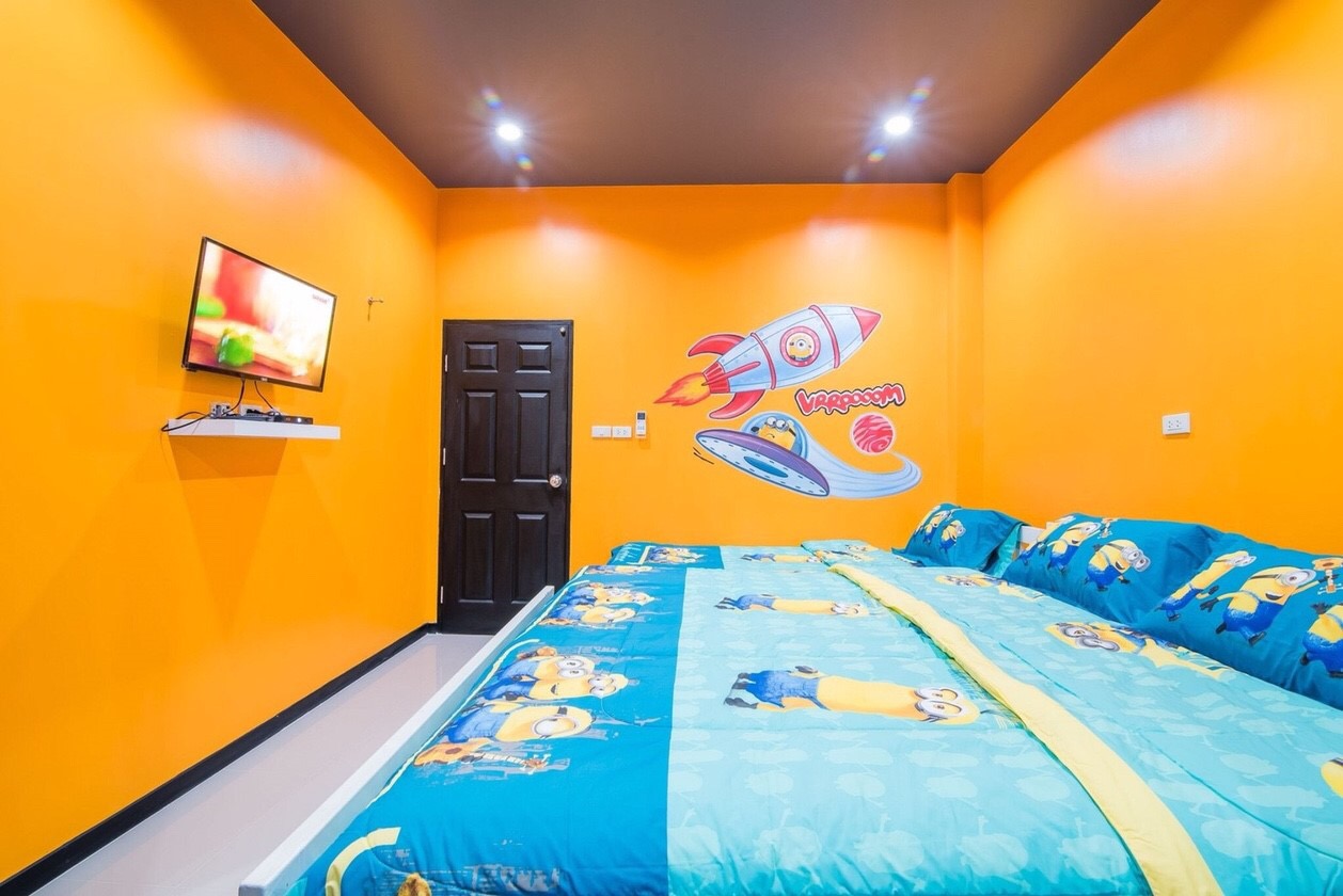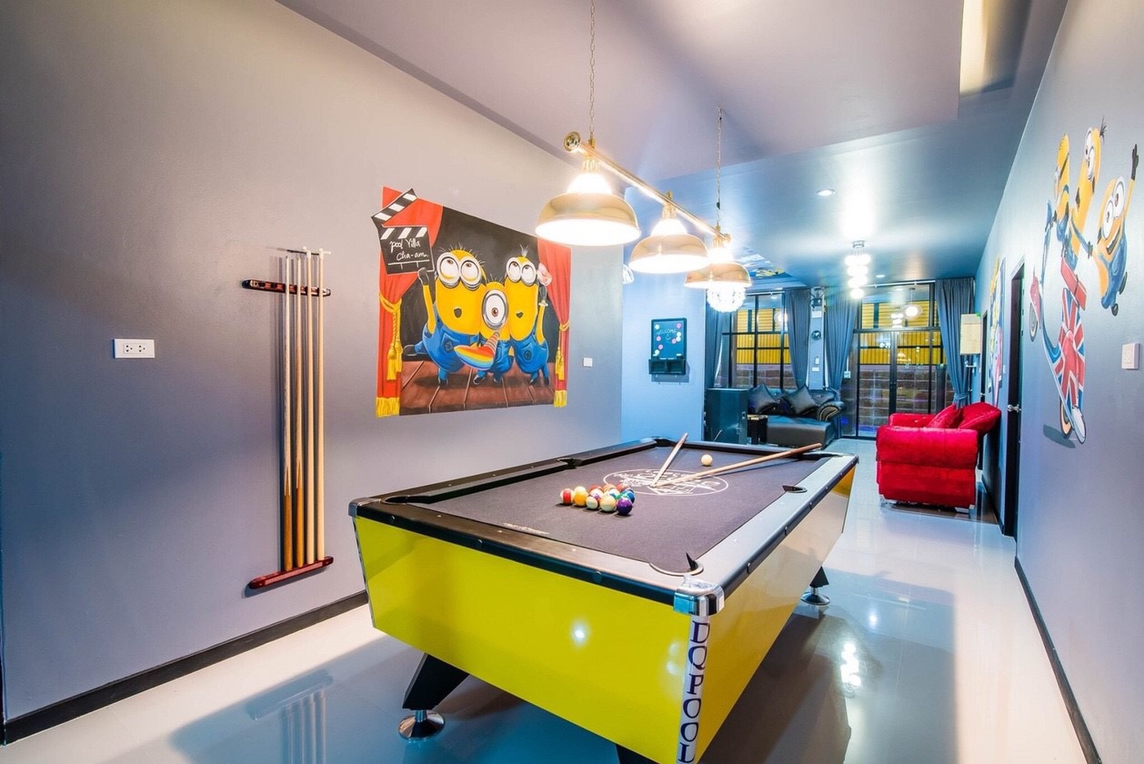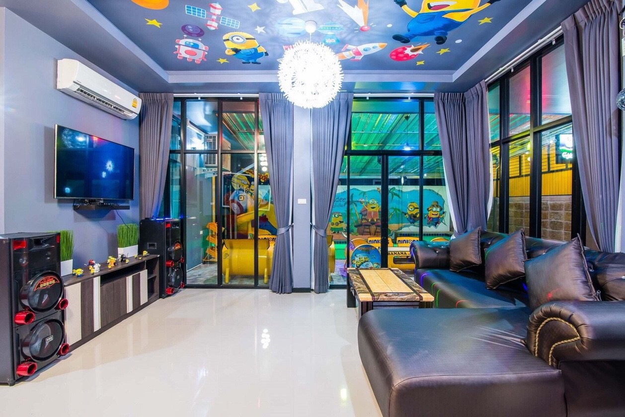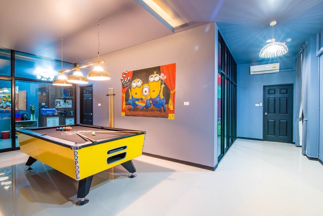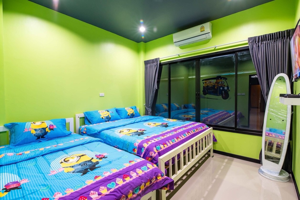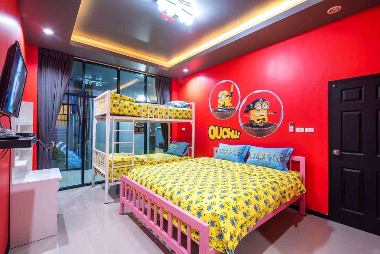 5 ห้องนอน (แอร์) 3 ห้องน้ำ 1 ห้องนั่งเล่น (แอร์) 1 ห้องครัวอุปกรณ์ครบครัน รองรับผู้เข้าพัก 20 คน คนที่ 21 ขึ้นไป เพิ่มคนละ 300 บาท พักสูงสุด 30 ท่าน (พร้อมที่นอนเสริมครบทุกท่าน) มีสระว่ายน้ำส่วนตัว ขนาด 4*6 เมตร สามารถเสียงดังได้ถึง 22.00 น. มีสิ่งอำนวยความสะดวกครบครัน ทีวี ตู้เย็น คาราโอเกะ ไฟเธค สไลเดอร์ โต๊ะพูล Wi-Fi อุปกรณ์เครื่องครัวครบชุด อุปกรณ์เครื่องใช้ส่วนตัวต้องเตรียมมาเอง เช่น ผ้าขนหนู แชมพู ยาสระผม
