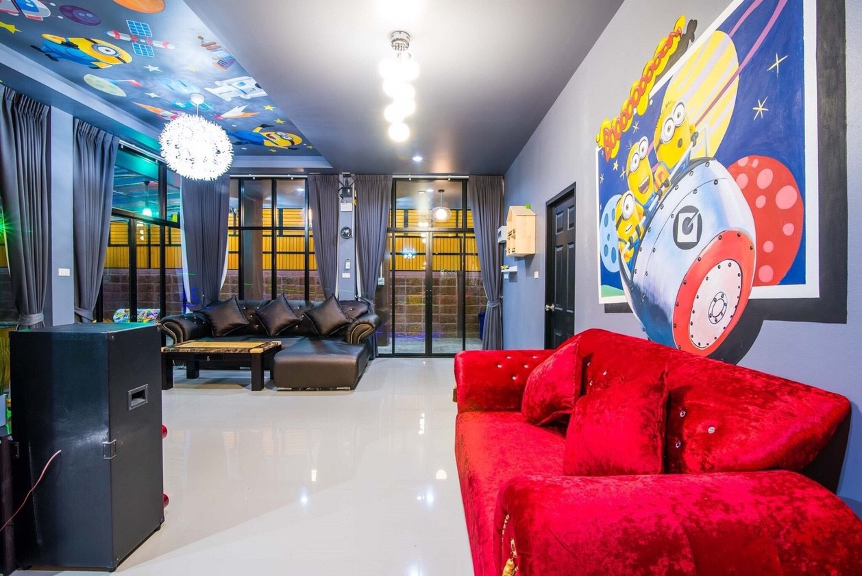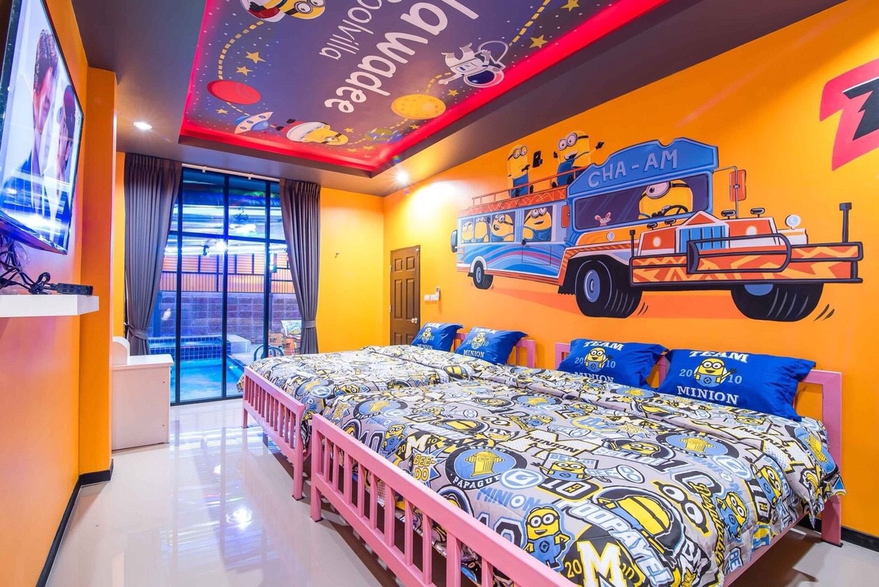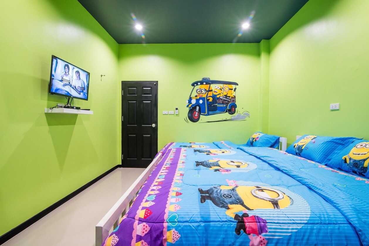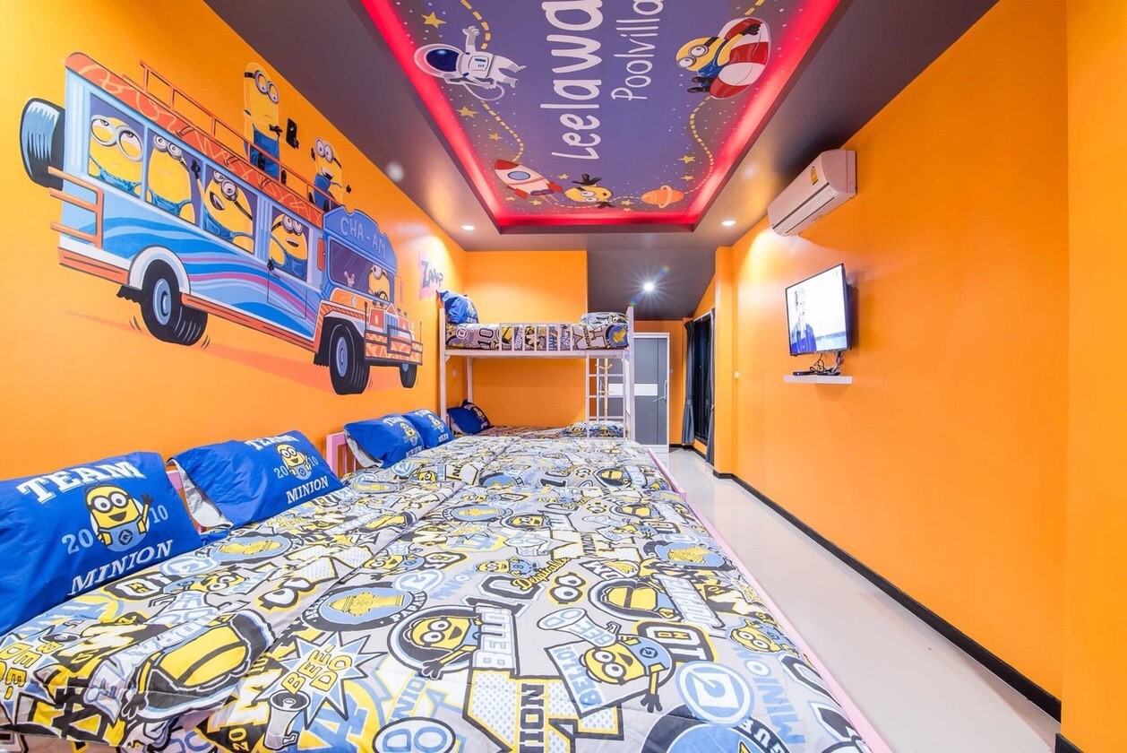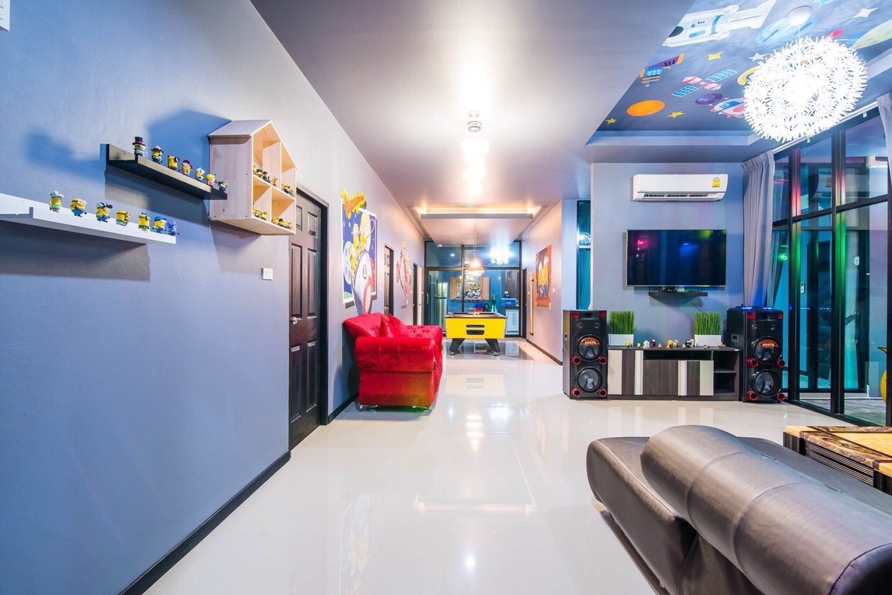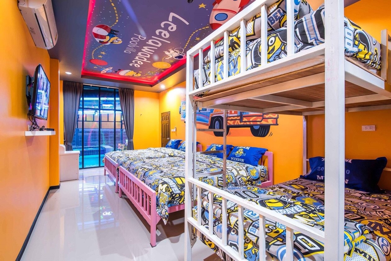5 ห้องนอน (แอร์) 3 ห้องน้ำ 1 ห้องนั่งเล่น (แอร์) 1 ห้องครัวอุปกรณ์ครบครัน รองรับผู้เข้าพัก 20 คน คนที่ 21 ขึ้นไป เพิ่มคนละ 300 บาท พักสูงสุด 30 ท่าน (พร้อมที่นอนเสริมครบทุกท่าน) มีสระว่ายน้ำส่วนตัว ขนาด 4*6 เมตร สามารถเสียงดังได้ถึง 22.00 น. มีสิ่งอำนวยความสะดวกครบครัน ทีวี ตู้เย็น คาราโอเกะ ไฟเธค สไลเดอร์ โต๊ะพูล Wi-Fi อุปกรณ์เครื่องครัวครบชุด อุปกรณ์เครื่องใช้ส่วนตัวต้องเตรียมมาเอง เช่น ผ้าขนหนู แชมพู ยาสระผม