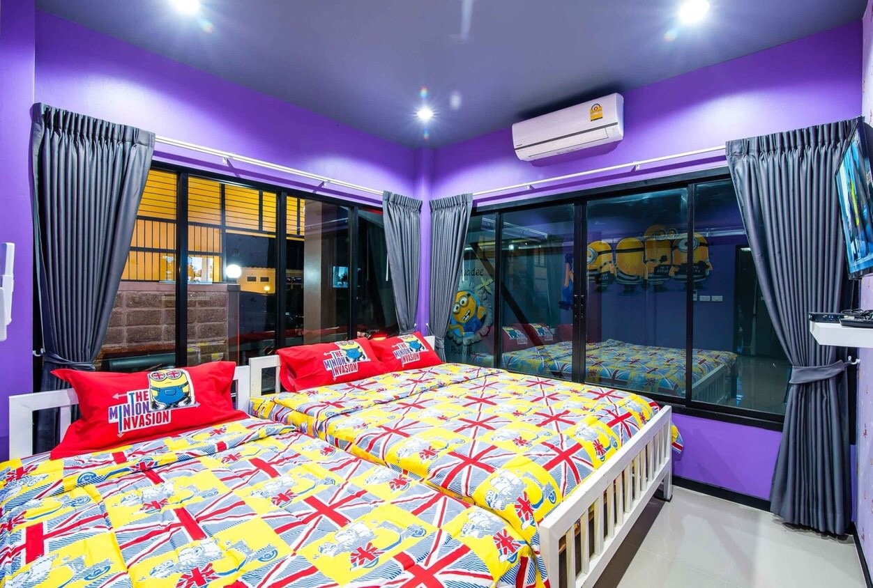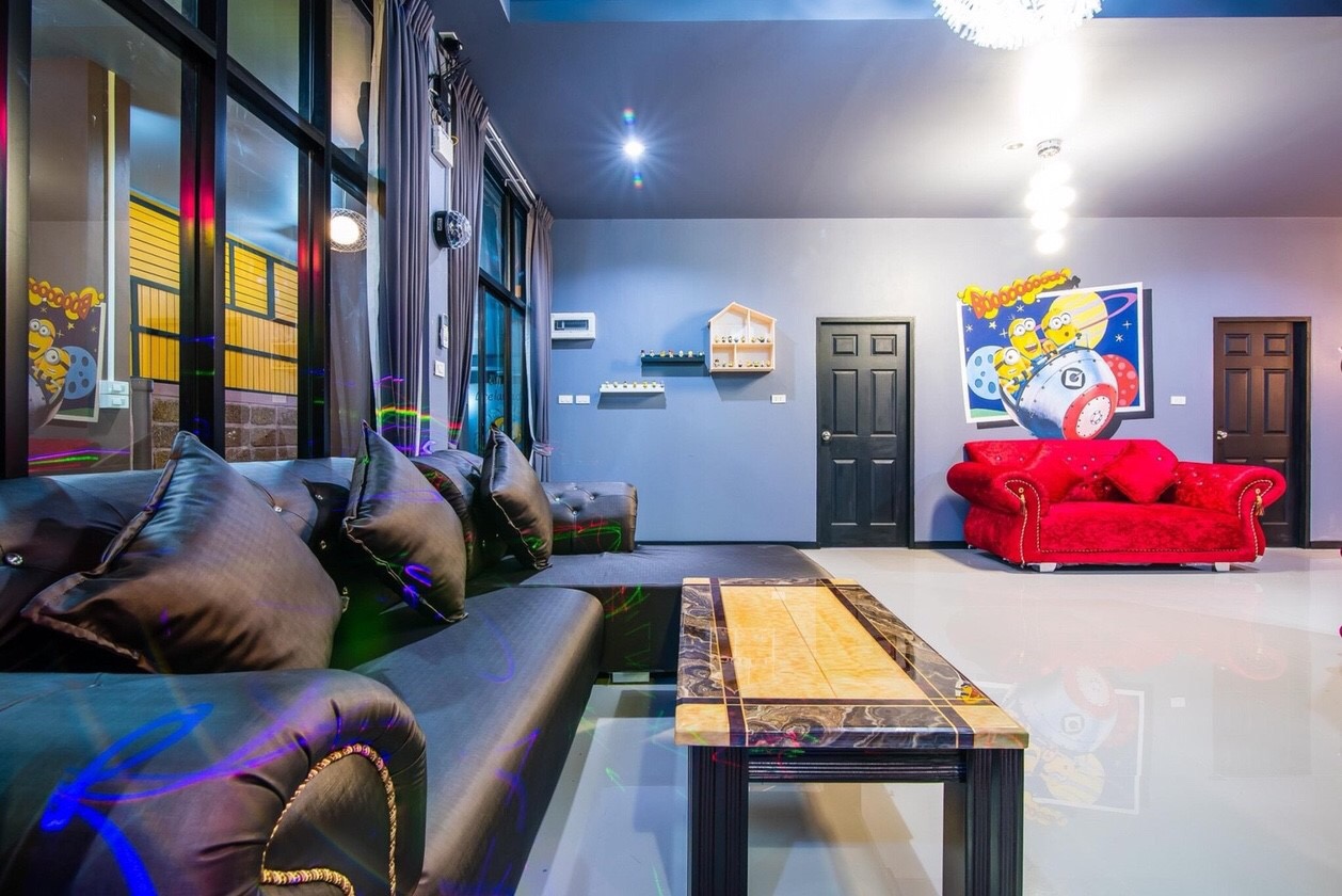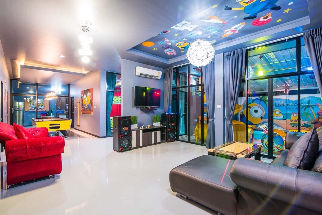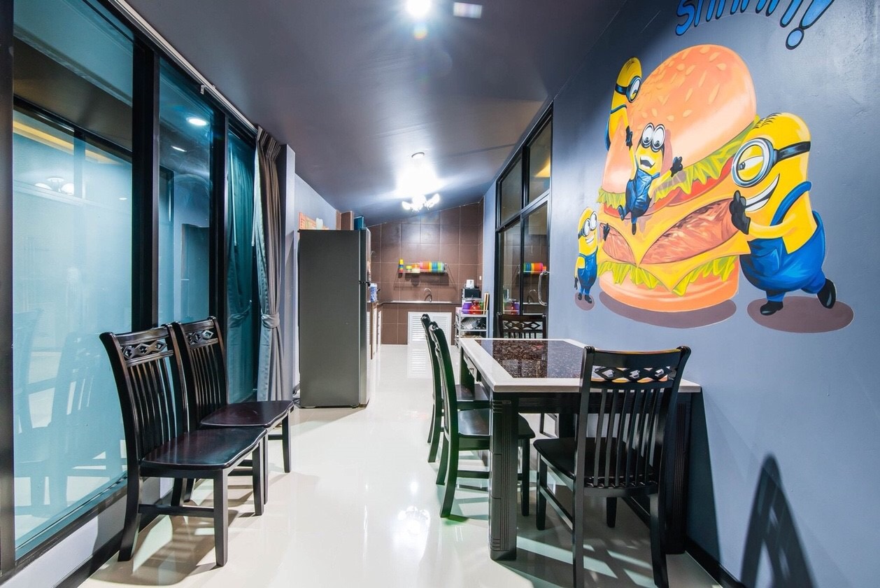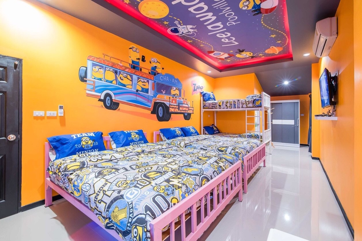 5 ห้องนอน (แอร์) 3 ห้องน้ำ 1 ห้องนั่งเล่น (แอร์) 1 ห้องครัวอุปกรณ์ครบครัน รองรับผู้เข้าพัก 20 คน คนที่ 21 ขึ้นไป เพิ่มคนละ 300 บาท พักสูงสุด 30 ท่าน (พร้อมที่นอนเสริมครบทุกท่าน) มีสระว่ายน้ำส่วนตัว ขนาด 4*6 เมตร สามารถเสียงดังได้ถึง 22.00 น. มีสิ่งอำนวยความสะดวกครบครัน ทีวี ตู้เย็น คาราโอเกะ ไฟเธค สไลเดอร์ โต๊ะพูล Wi-Fi อุปกรณ์เครื่องครัวครบชุด อุปกรณ์เครื่องใช้ส่วนตัวต้องเตรียมมาเอง เช่น ผ้าขนหนู แชมพู ยาสระผม