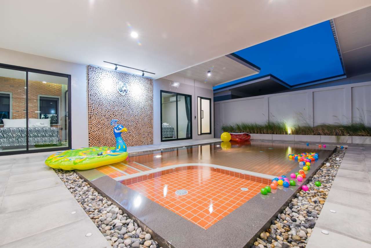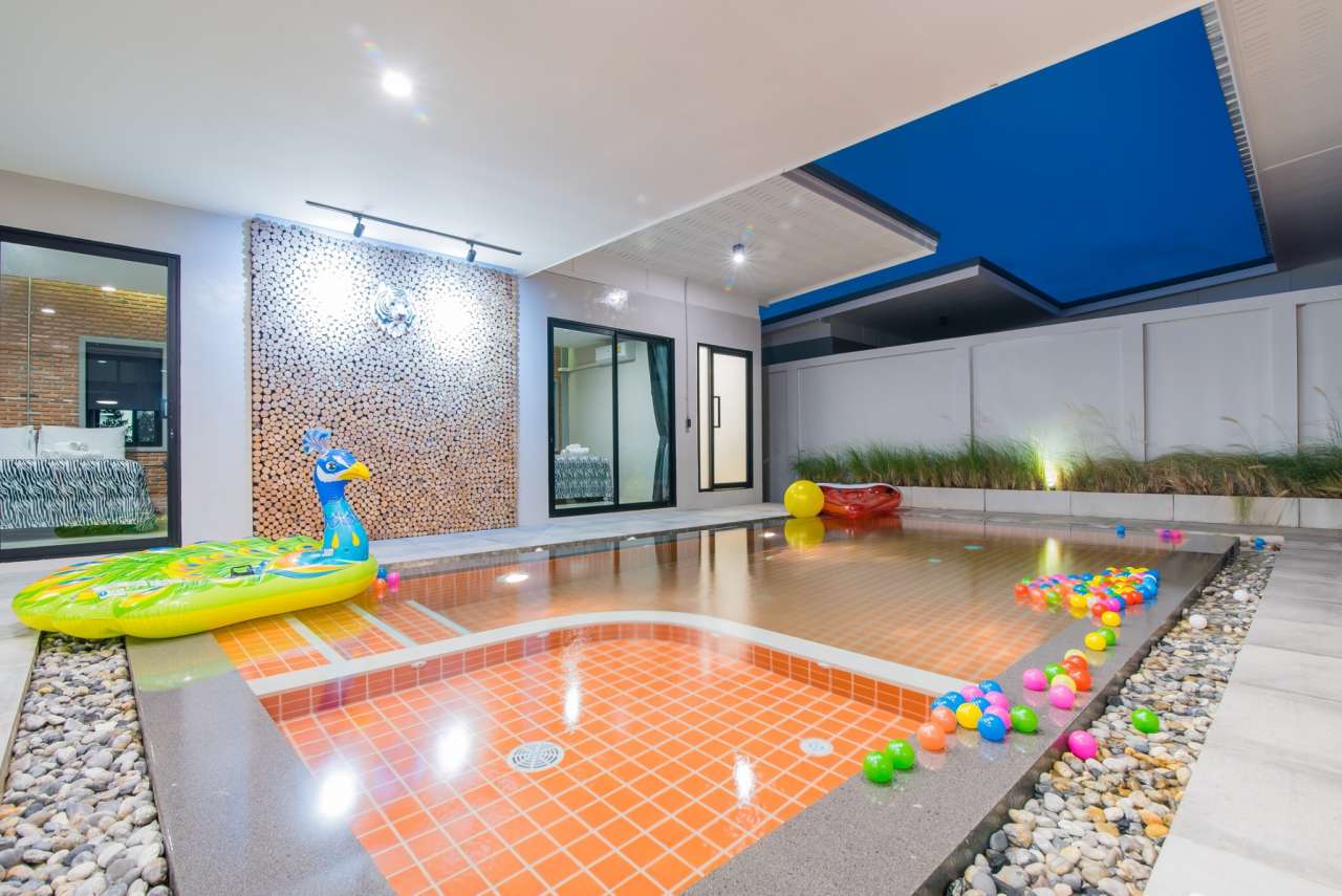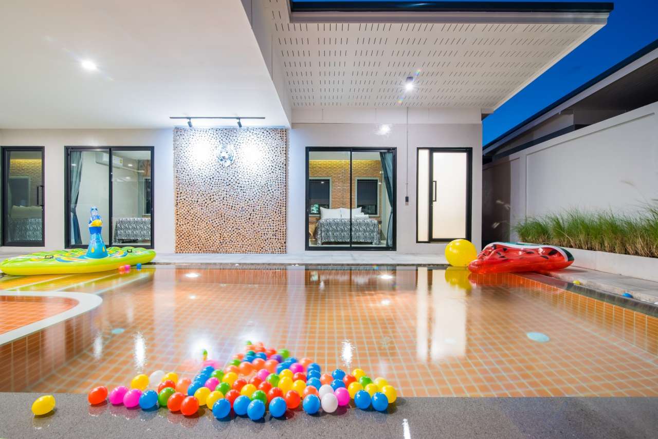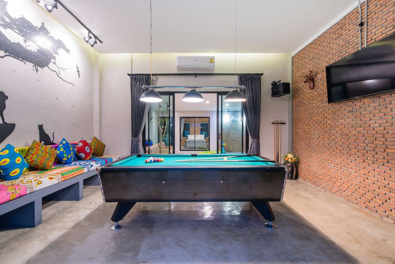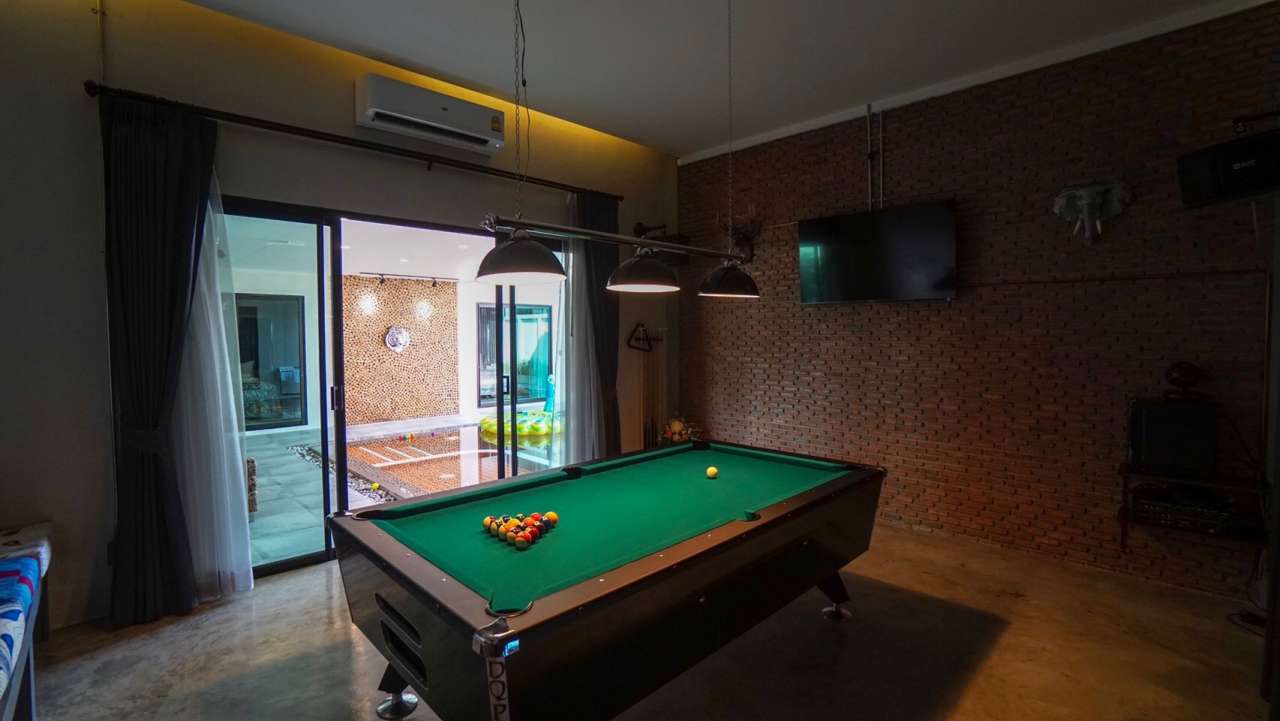 4 ห้องนอน (แอร์) 5 ห้องน้ำ 1 ห้องนั่งเล่น (แอร์) 1 ห้องครัวอุปกรณ์ครบครัน รองรับผู้เข้าพัก 10 คน คนที่ 11 ขึ้นไป เพิ่มคนละ 400 บาท พักสูงสุด 16 ท่าน (พร้อมที่นอนเสริม) มีสระว่ายน้ำส่วนตัว ขนาด 3.5*7 เมตร สามารถเสียงดังได้ถึง 22.00 น. มีสิ่งอำนวยความสะดวกครบครัน ทีวี ตู้เย็น คาราโอเกะ โต๊ะพูล อุปกรณ์เครื่องครัวครบชุด อุปกรณ์เครื่องใช้ส่วนตัวต้องเตรียมมาเอง เช่น ผ้าขนหนู แชมพู ยาสระผม