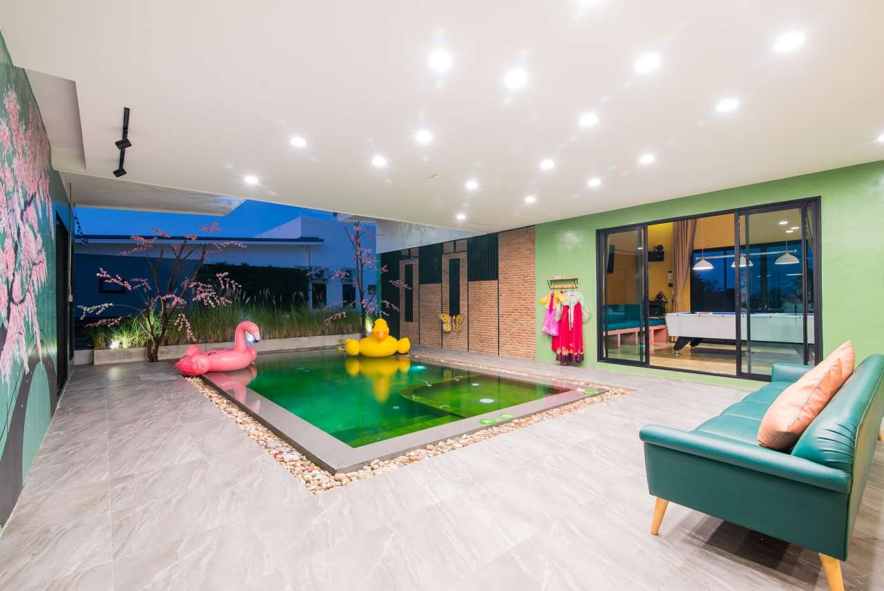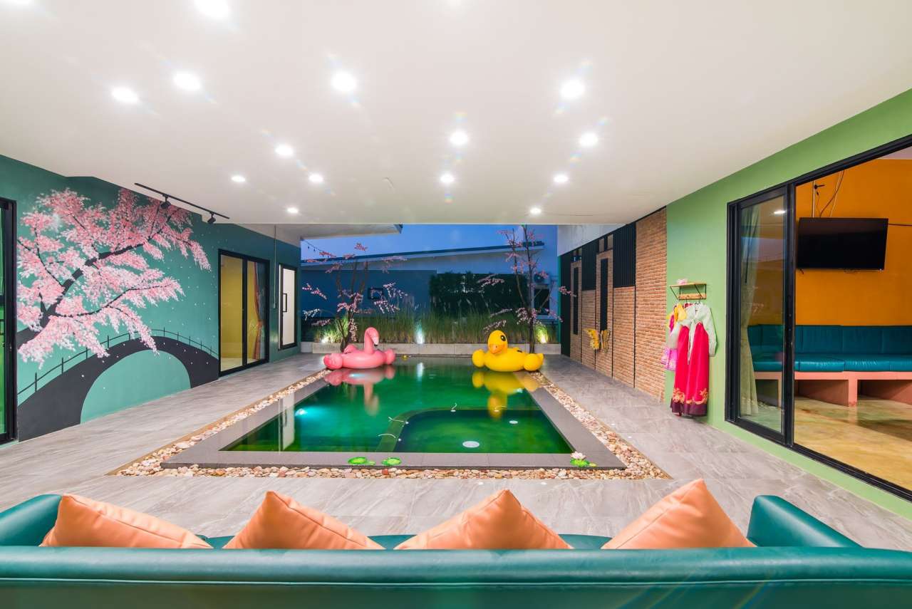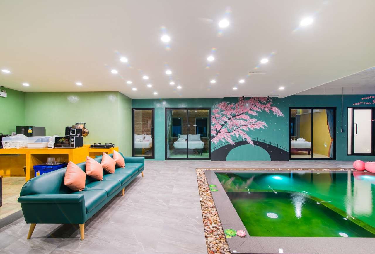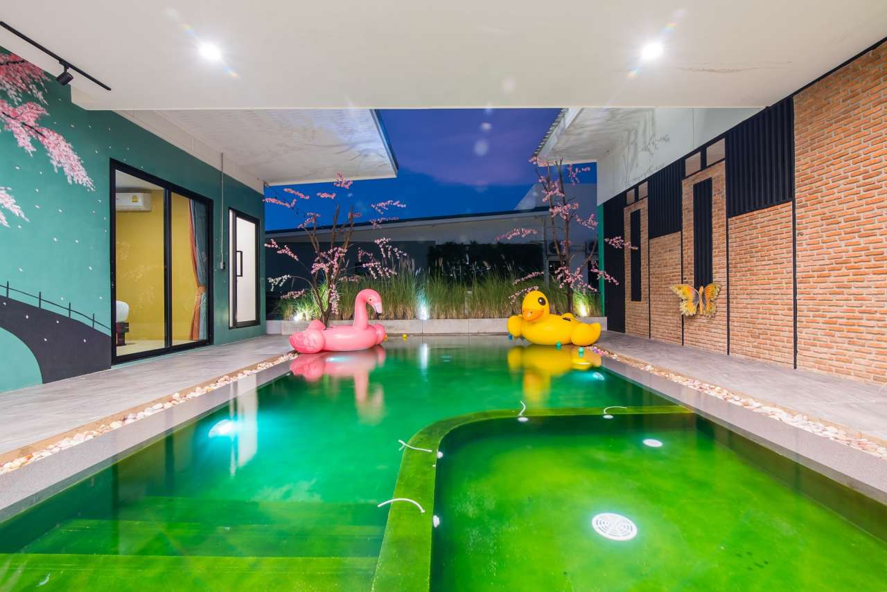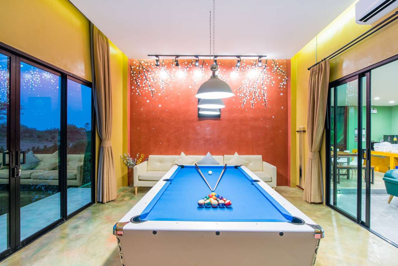 4 ห้องนอน (แอร์) 5 ห้องน้ำ 1 ห้องนั่งเล่น (แอร์) 1 ห้องครัวอุปกรณ์ครบครัน รองรับผู้เข้าพัก 10 คน คนที่ 11 ขึ้นไป เพิ่มคนละ 400 บาท พักสูงสุด 16 ท่าน (พร้อมที่นอนเสริม) มีสระว่ายน้ำส่วนตัว ขนาด 3.5*7 เมตร สามารถเสียงดังได้ถึง 22.00 น. มีสิ่งอำนวยความสะดวกครบครัน ทีวี ตู้เย็น คาราโอเกะ โต๊ะพูล อุปกรณ์เครื่องครัวครบชุด อุปกรณ์เครื่องใช้ส่วนตัวต้องเตรียมมาเอง เช่น ผ้าขนหนู แชมพู ยาสระผม