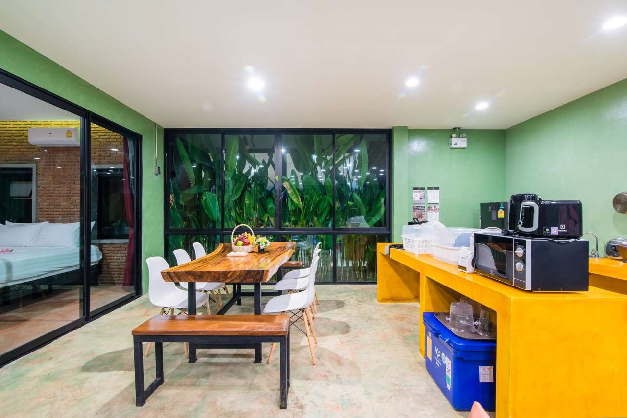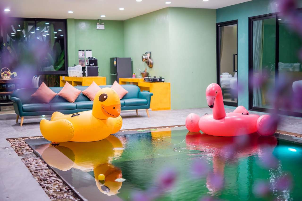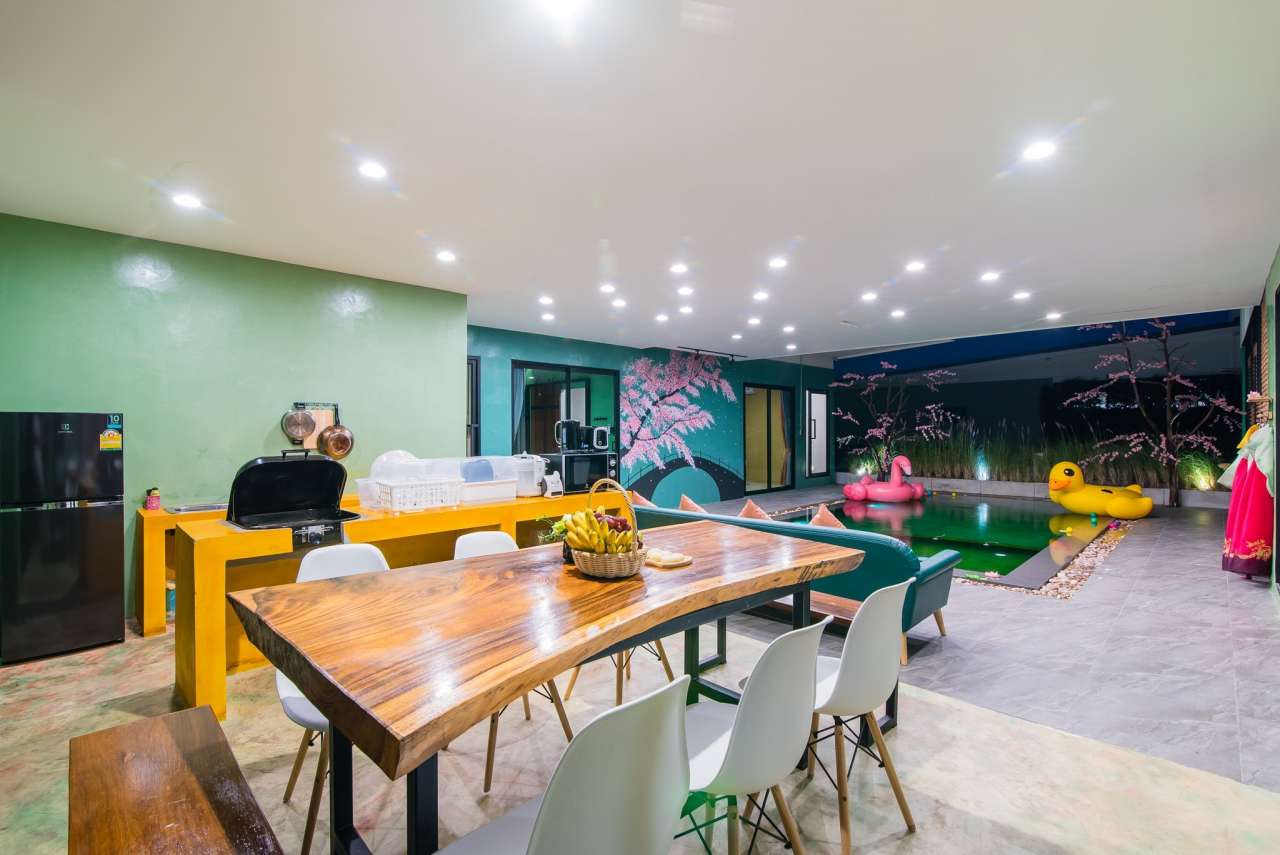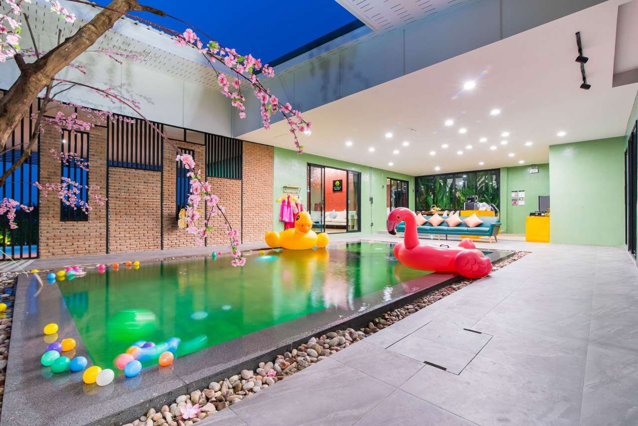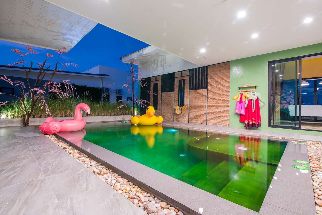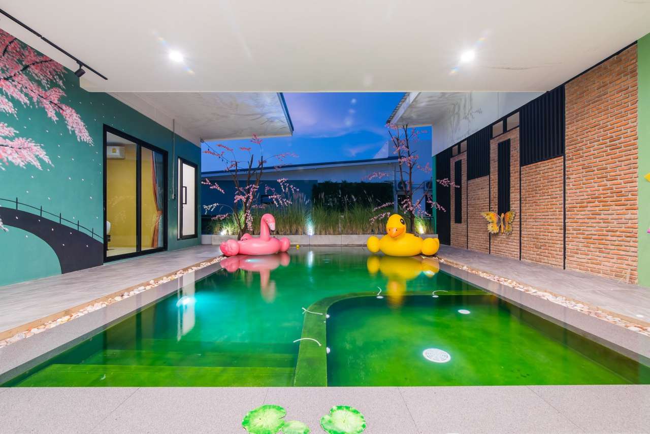 4 ห้องนอน (แอร์) 5 ห้องน้ำ 1 ห้องนั่งเล่น (แอร์) 1 ห้องครัวอุปกรณ์ครบครัน รองรับผู้เข้าพัก 10 คน คนที่ 11 ขึ้นไป เพิ่มคนละ 400 บาท พักสูงสุด 16 ท่าน (พร้อมที่นอนเสริม) มีสระว่ายน้ำส่วนตัว ขนาด 3.5*7 เมตร สามารถเสียงดังได้ถึง 22.00 น. มีสิ่งอำนวยความสะดวกครบครัน ทีวี ตู้เย็น คาราโอเกะ โต๊ะพูล อุปกรณ์เครื่องครัวครบชุด อุปกรณ์เครื่องใช้ส่วนตัวต้องเตรียมมาเอง เช่น ผ้าขนหนู แชมพู ยาสระผม