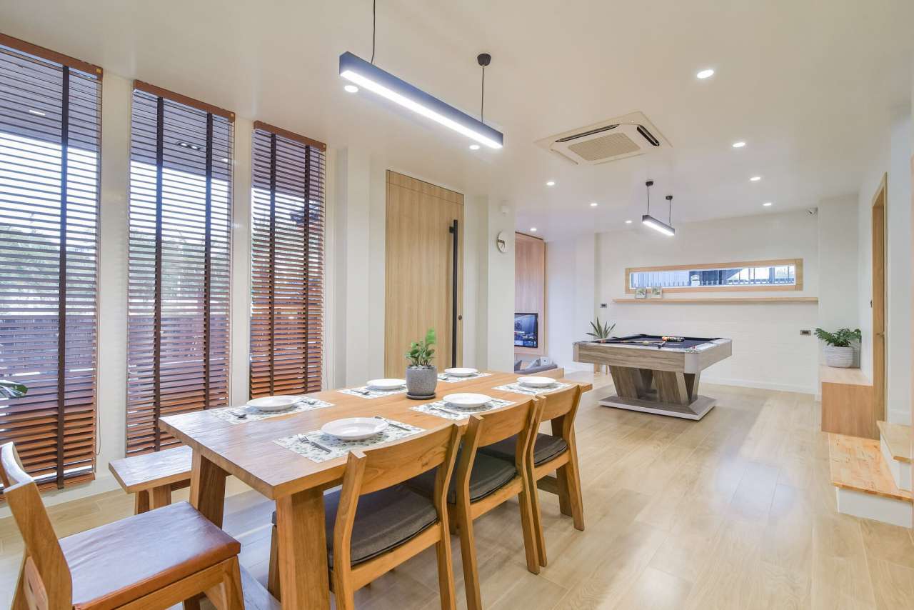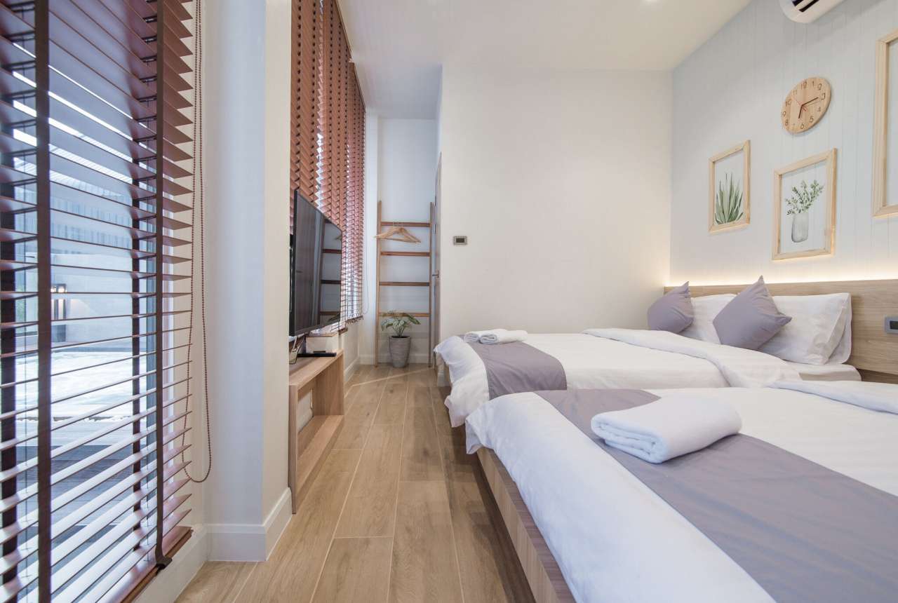 4 ห้องนอน (แอร์) 4 ห้องน้ำ 1 ห้องนั่งเล่น (แอร์) 1 ห้องครัวอุปกรณ์ครบครัน รองรับผู้เข้าพัก 12 คน คนที่ 13 ขึ้นไป เพิ่มคนละ 1,000 บาท พักสูงสุด 14 ท่าน (พร้อมที่นอนเสริมครบทุกท่าน) มีสระว่ายน้ำส่วนตัว สามารถเสียงดังได้ถึง 22.00 น. มีสิ่งอำนวยความสะดวกครบครัน ทีวี ตู้เย็น คาราโอเกะ โต๊ะสนุก Wi-Fi อุปกรณ์เครื่องครัวครบชุด พร้อมอุปกรณ์เครื่องใช้ส่วนตัวต้อง เช่น ผ้าขนหนู แชมพู ยาสระผม