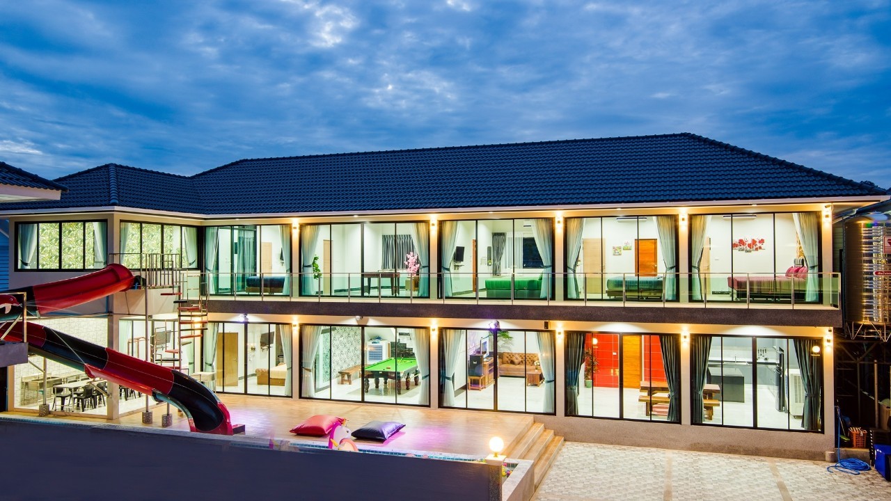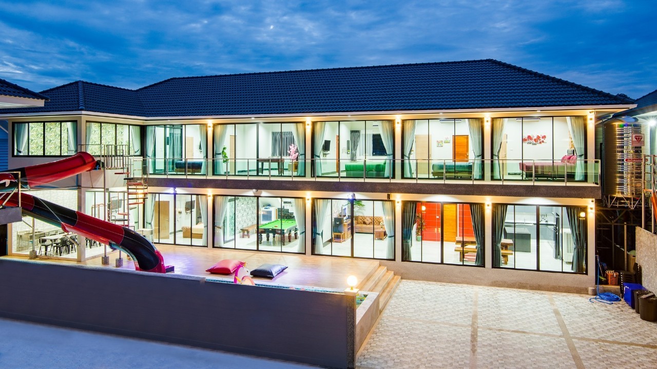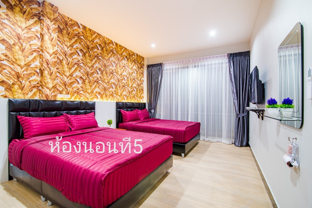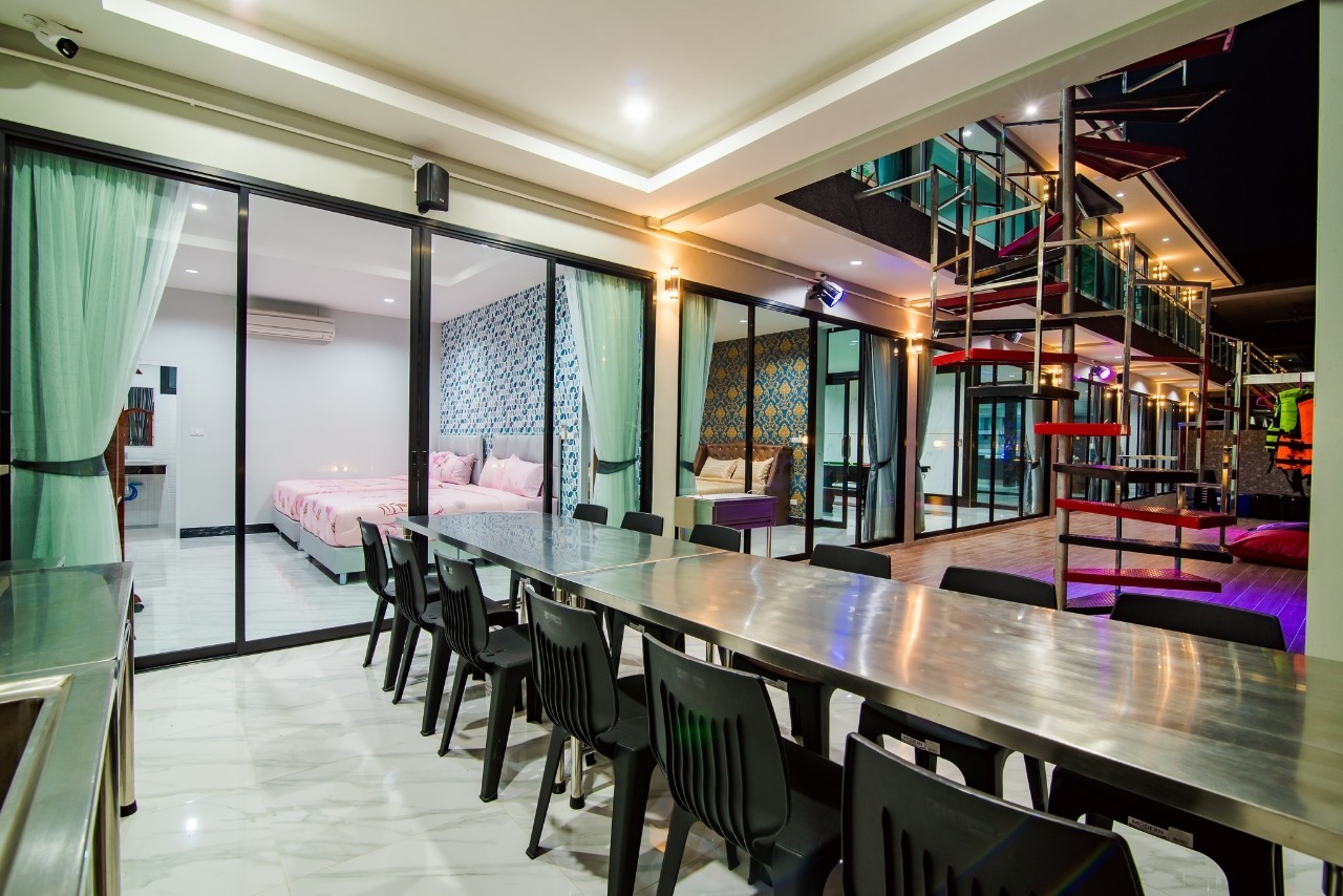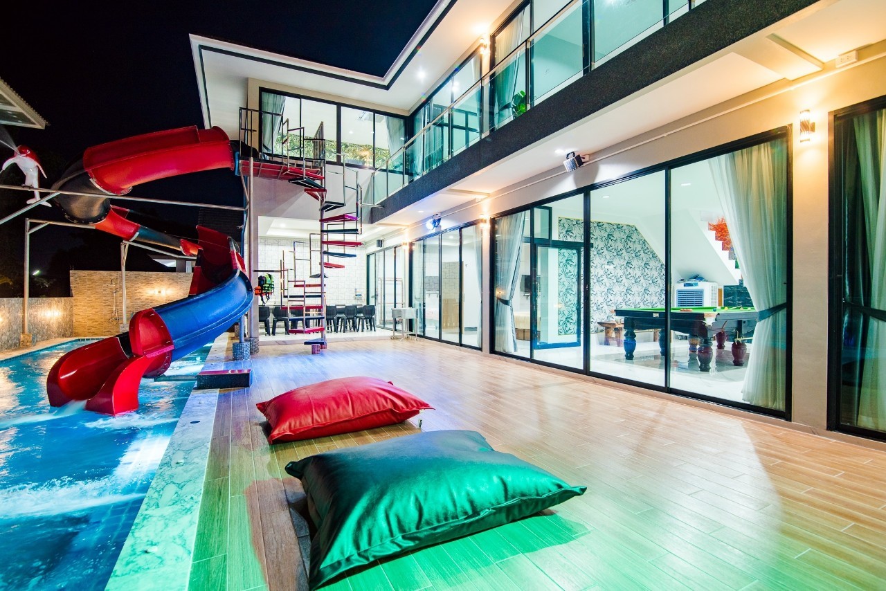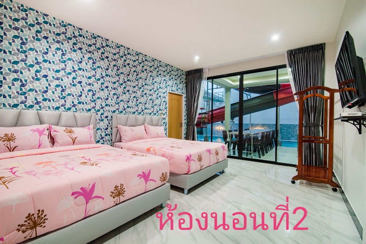 6 ห้องนอน (แอร์) 6 ห้องน้ำ 1 ห้องนั่งเล่น (แอร์) รองรับผู้เข้าพัก 25 คน คนที่ 26 ขึ้นไป เพิ่มคนละ 400 บาท พักสูงสุด 30 ท่าน มีสระว่ายน้ำส่วนตัว ขนาด 17 เมตร (มีสระเด็ก) สามารถเสียงดังได้ถึง 22.00 น. มีสิ่งอำนวยความสะดวกครบครัน สไลเดอร์20เมตร ทีวีทุกห้องนอน ตู้เย็น คาราโอเกะ ไฟเธค Wi-Fi โต๊ะสนุ๊ก5×10 โต๊ะโกบอล โดร์เป่าผมมีทุกห้องนอน อุปกรณ์เครื่องครัวครบชุด อุปกรณ์เครื่องใช้ส่วนตัวต้องเตรียมมาเอง เช่น ผ้าขนหนู แชมพู ยาสระผม (ไม่รับสัตว์เลี้ยง)