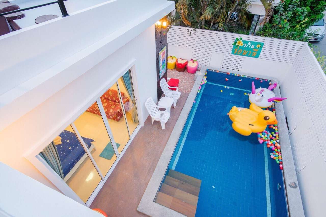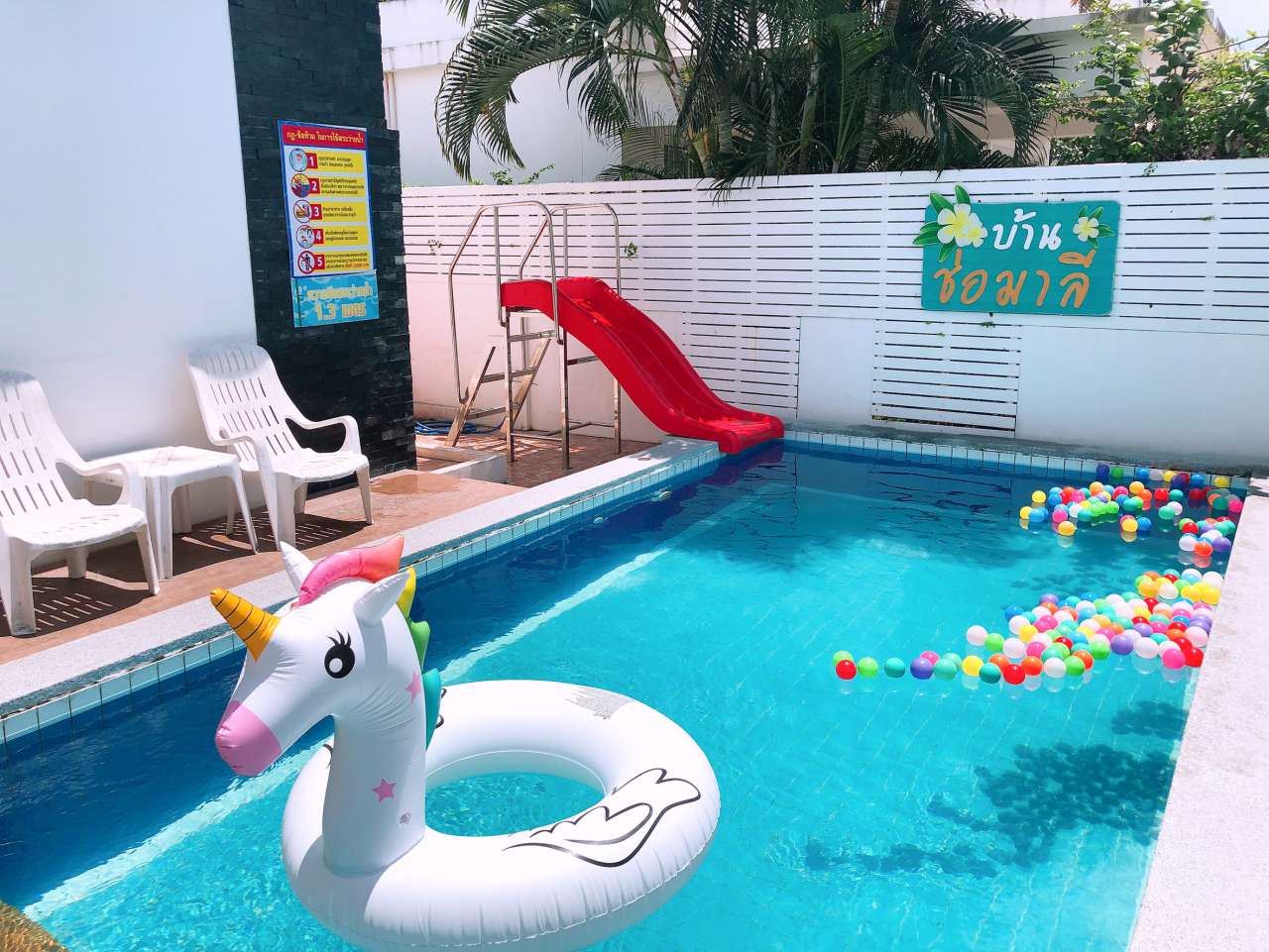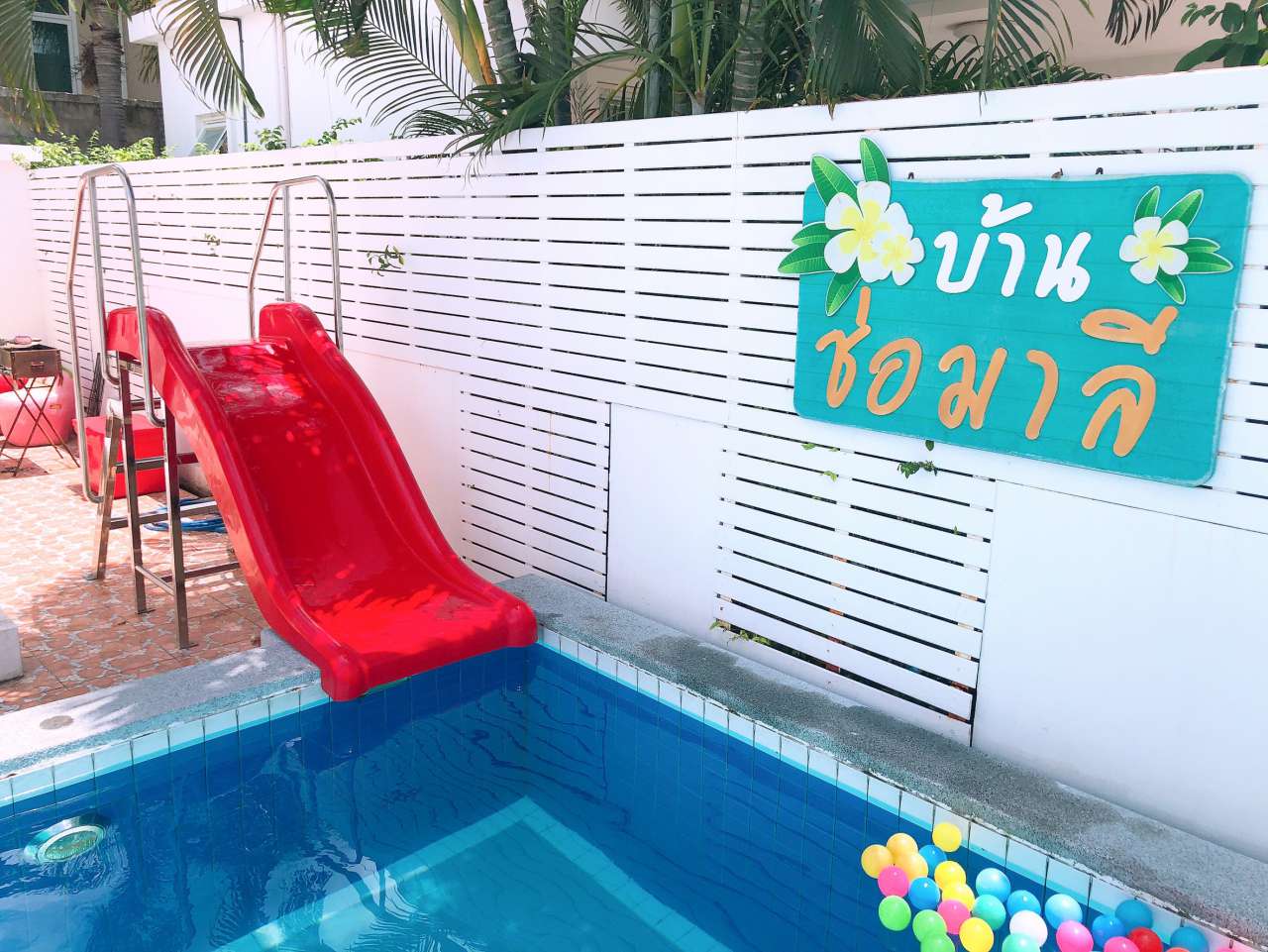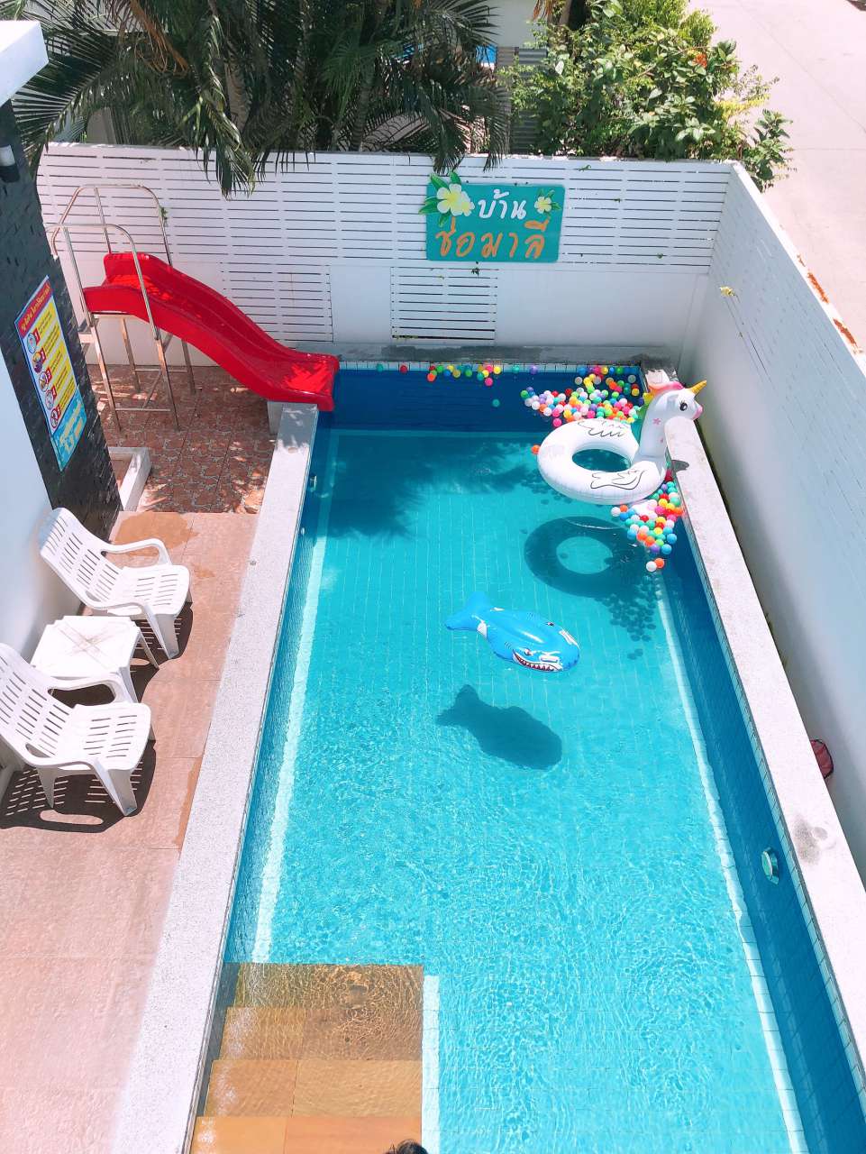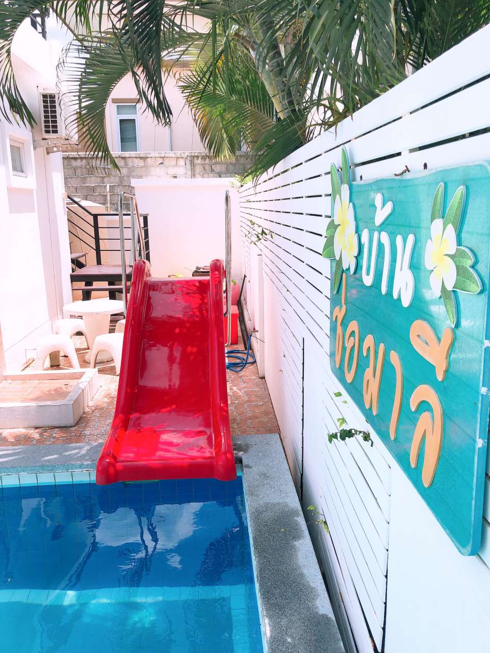 3 ห้องนอน (แอร์) 2 ห้องน้ำ 1 ห้องนั่งเล่น (แอร์) 1 ห้องครัวอุปกรณ์ครบครัน รองรับผู้เข้าพัก 8 คน สำหรับเด็ก ต่ำกว่า 10 ขวบ ฟรี 2 คน คนที่ 9 ขึ้นไป เพิ่มคนละ 300 บาท พักสูงสุด 12 ท่าน (ที่นอนเสริมต้องเตรียมมาเอง) มีสระว่ายน้ำส่วนตัว ขนาด 3*6 เมตร สามารถเสียงดังได้ถึง 22.00 น. มีสิ่งอำนวยความสะดวกครบครัน ทีวี ฟรีคาราโอเกะ โต๊ะพูล ตู้เย็น อุปกรณ์เครื่องครัวครบชุด อุปกรณ์เครื่องใช้ส่วนตัวต้องเตรียมมาเอง เช่น ผ้าขนหนู แชมพู ยาสระผม (ห้ามนำสัตว์เลี้ยงเข้าพัก) ราคาวันศุกร์ 3,500/8 คน